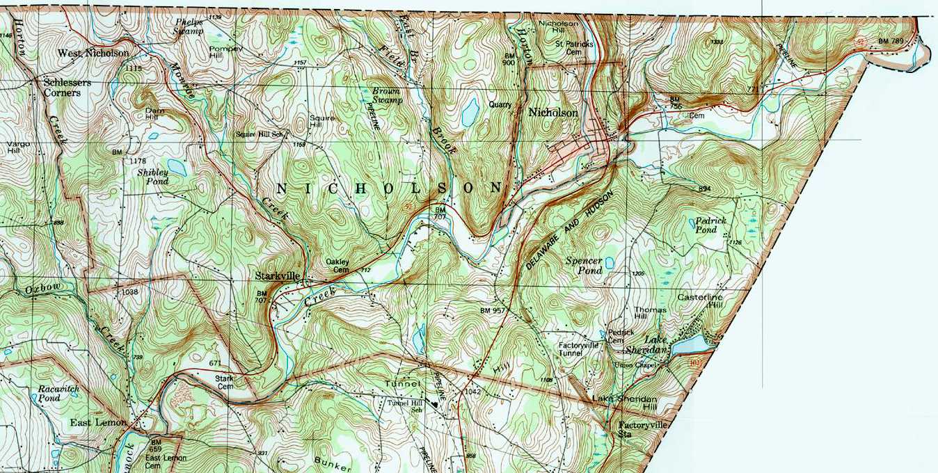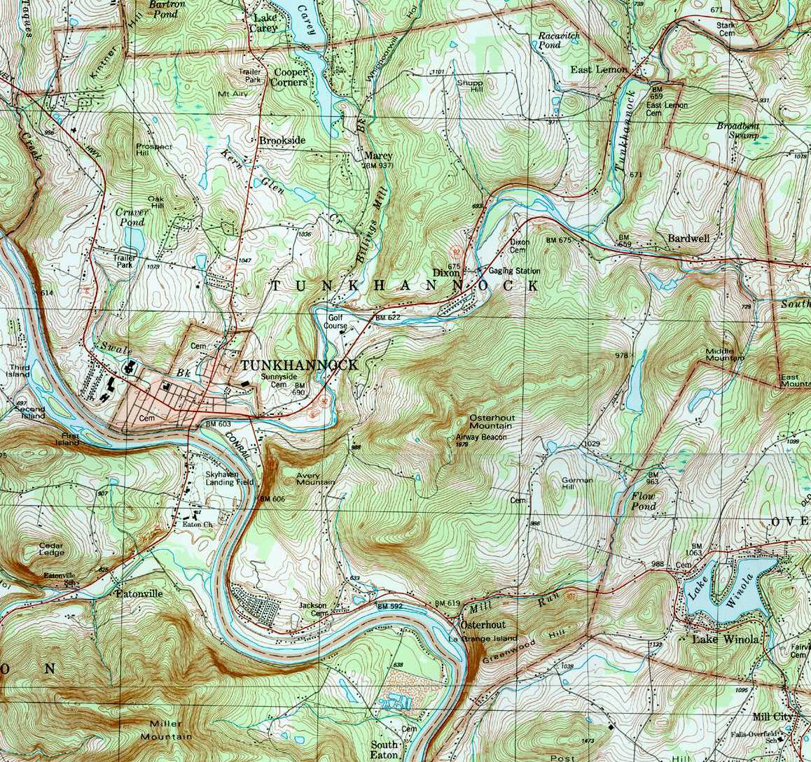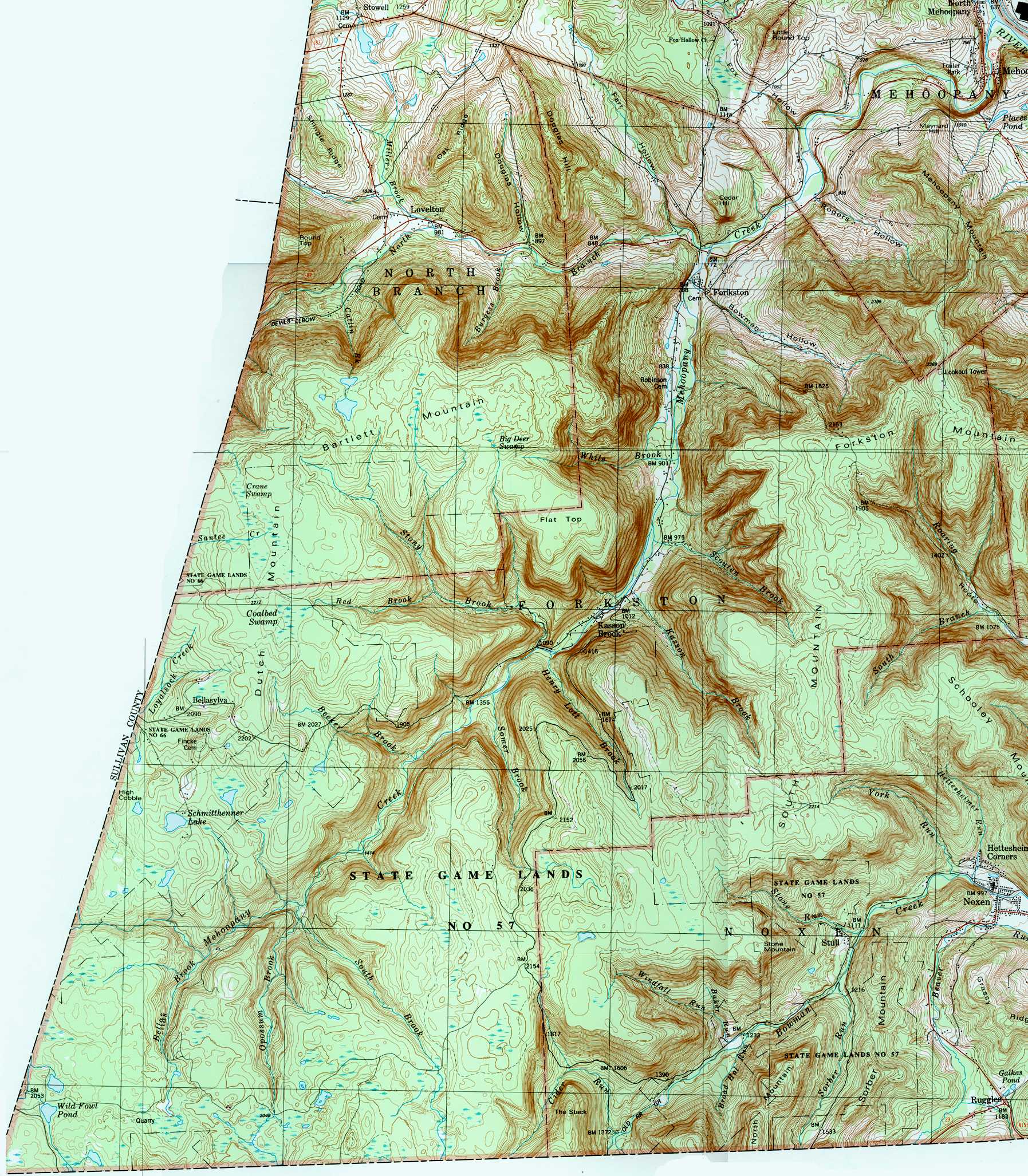 Image Map: This is a clickable image map of townships and boroughs in Wyoming County Pennsylvania. A text list of the township maps is shown below. The township images are cropped from a 1/50,000 USGS Geological Survey Map of Wyoming County dated 1987; based on 1/24,000 maps dated 1945 (69PR) through 1946 (83PR). Adjacent counties shown on the image map have active links to their USGS maps. Note that some townships are combined into one image. |
