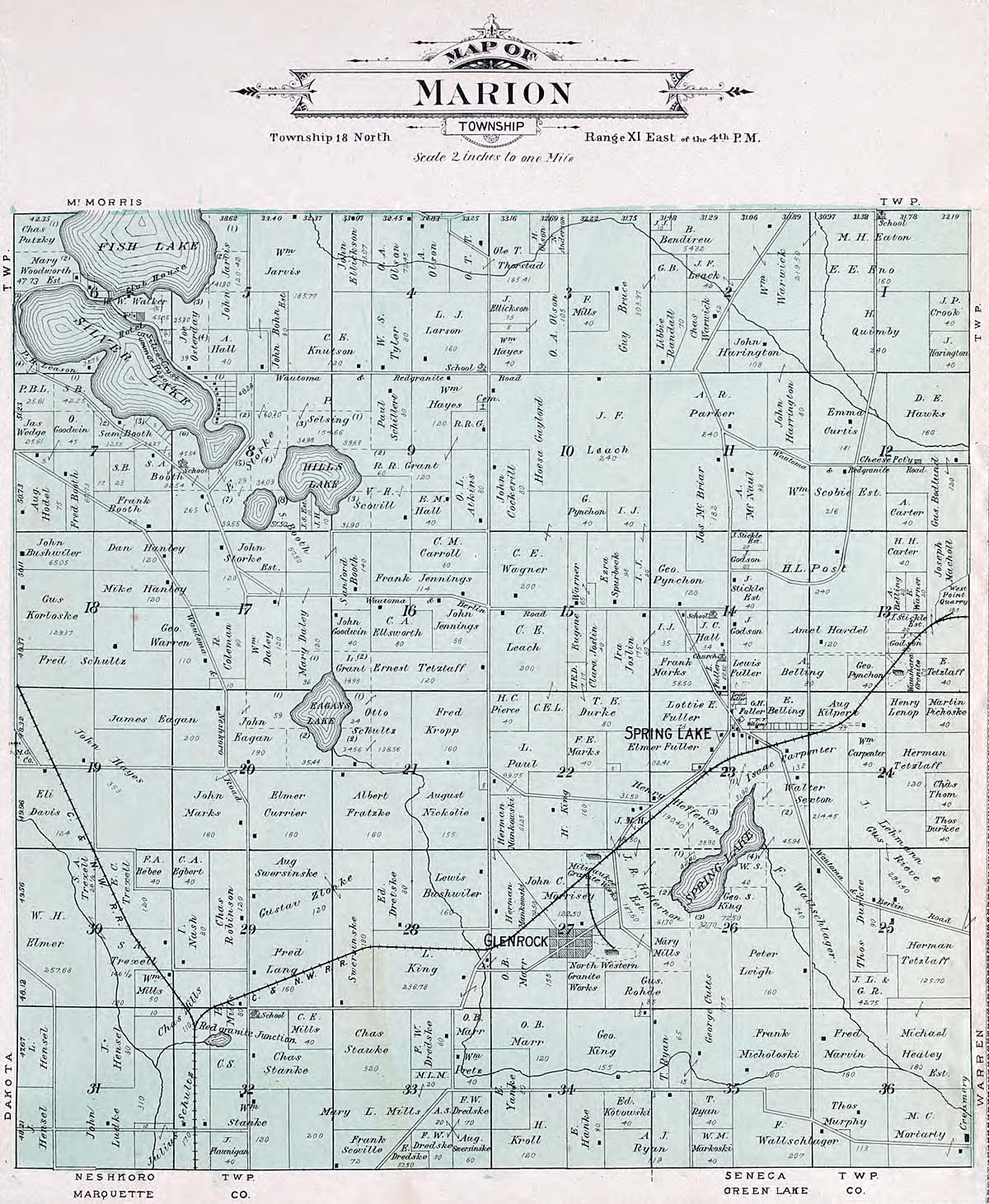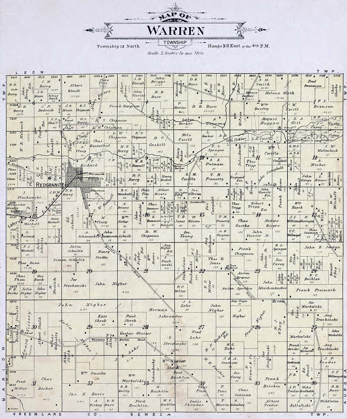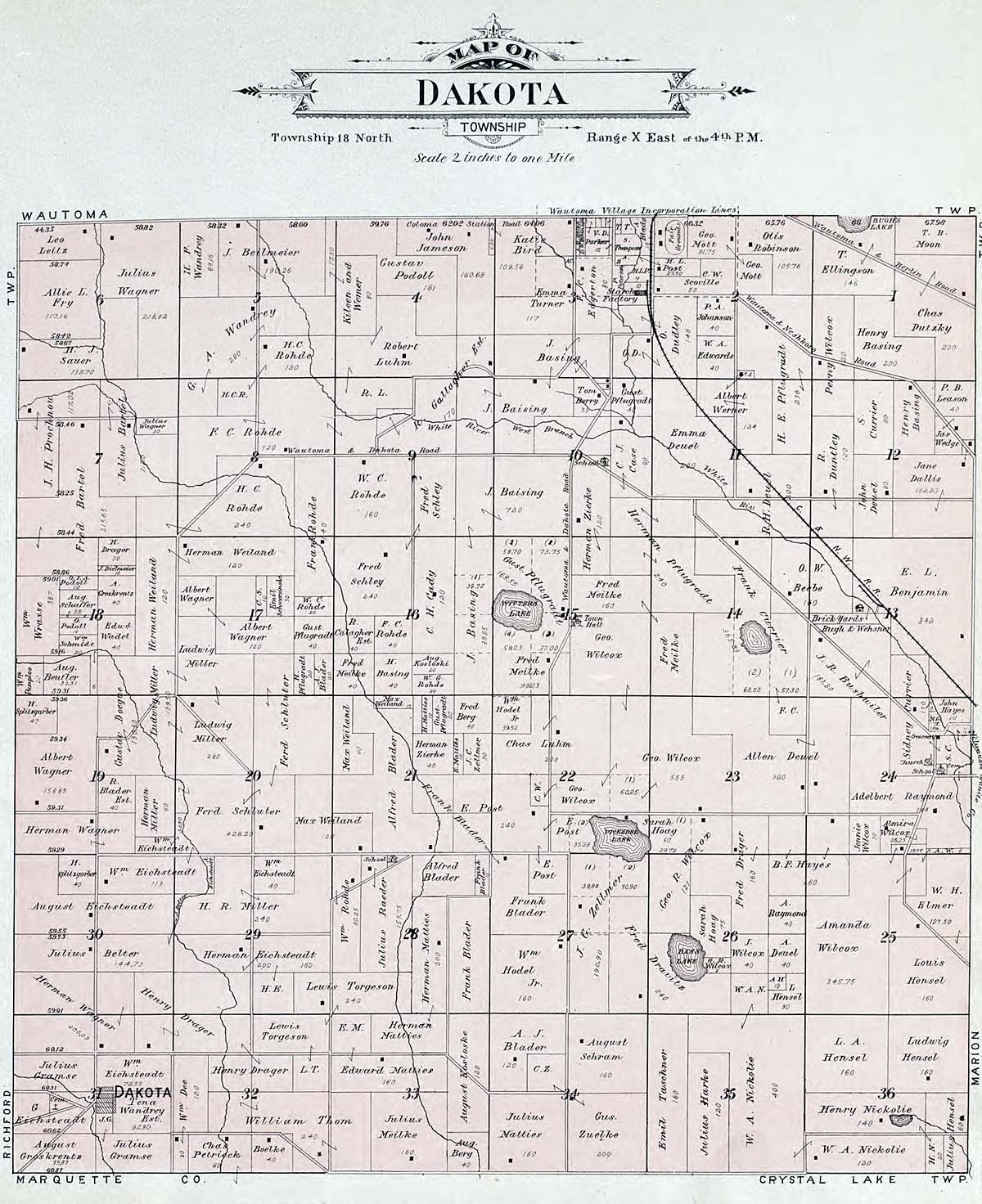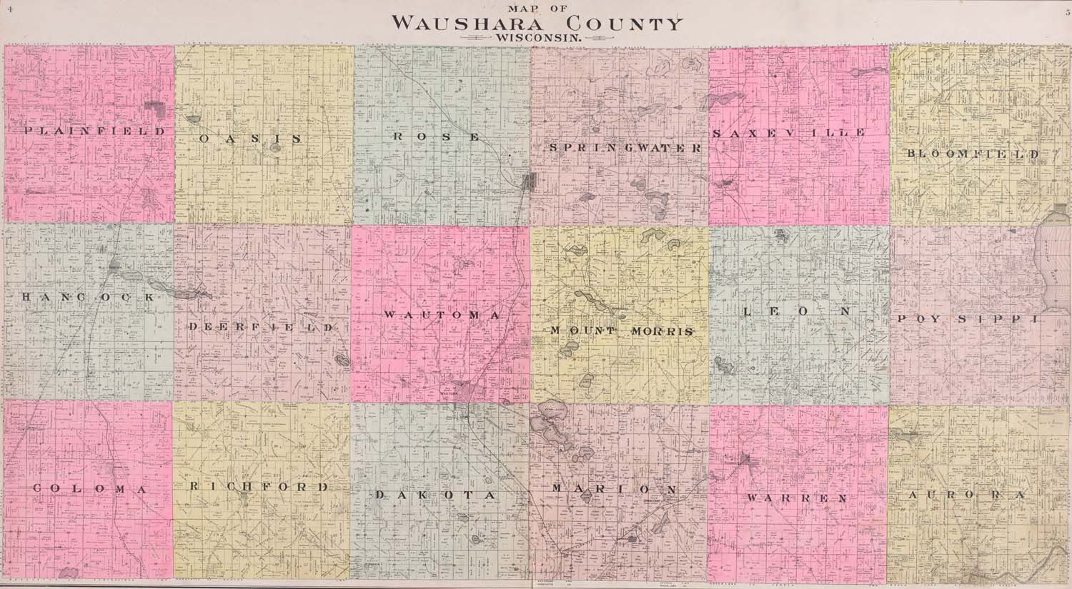 Waushara County - Atlas of Waushara County Wisconsin. Containing Maps of Villages, Cities and Townships of the County. Published by C. A. McIntyre and C. H. Terrill Wautoma, Wis. 1906 Copyrighted W. Wangersheim, Lith. & Map Printer, Chicago Submitted by Joy Fisher.