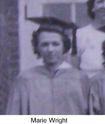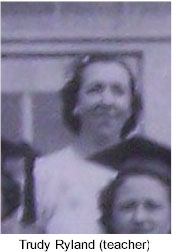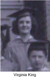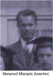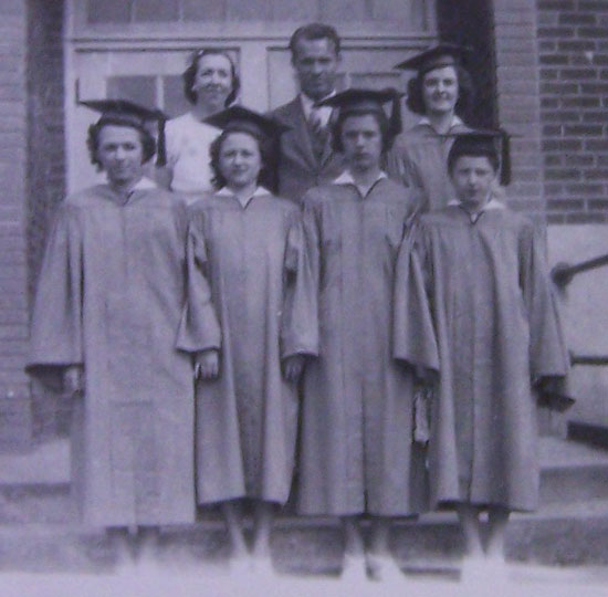 Source: Virginia King McBee Scrapbook, Contributed by Ray County Genealogical Association (Click on face of the person to identify) ------ 1938 Graduating Class - Camden Front Row: Marie Wright, Lorene Bailey, Margaret Rogers, Lena Mary Waller Back Row (L to R): Trudy Ryland (teacher), Norwood Marquis (teacher) [in later years they were married], Virginia King |